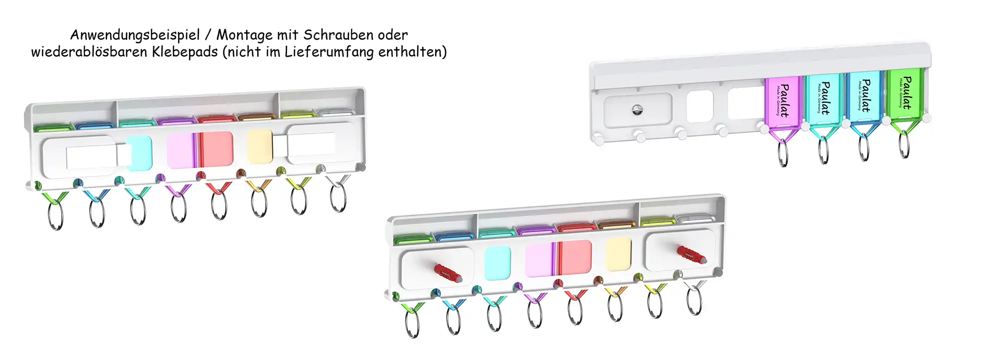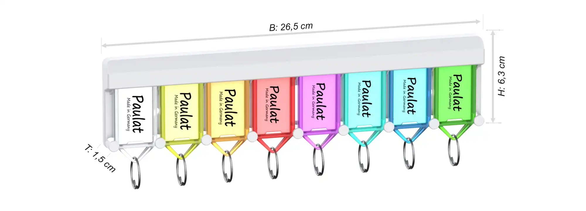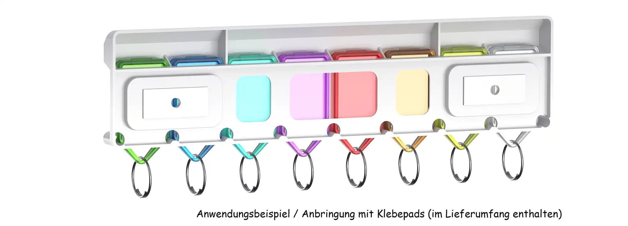 - Use / Contents: Key rack for wall, cabinet, or door mounting. Includes 8 colorful key tags (No. 12) with labeling plates and a 22mm key ring.